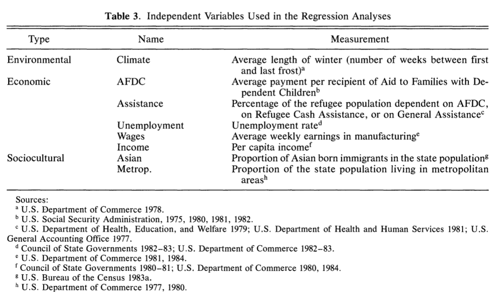 The relevance of this theoretical discussion helps with my reading of Desbarats (1985). At the time of this writing, researchers in the United States were very interested in studying the settlement patterns of newly arrived Southeast Asian persons. Driven by Congressional mandate and also by curiosity in the academy about the life trajectories of refugees from Southeast Asia, studies such as Desbarats’ examine the where and why of migration.