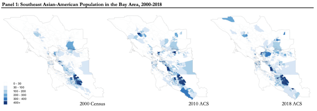 Below is a panel taken out of my proposal. Using public data, I construct maps to show the residential patterns of SEAAs across the Bay Area from 2000 to 2018. In short, my hypothesis is that forces behind hyper-gentrification, resegregation, and racial banishment has led to a dispersal of what I argue are essential communities for the survival and health of the SEAA population. Further, this work will have implications for all in the region, since the outcomes for one community reflects outcomes for everyone else.